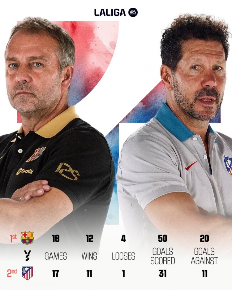第1.巴薩,18場12勝2平4負(fù),進50球、丟20球