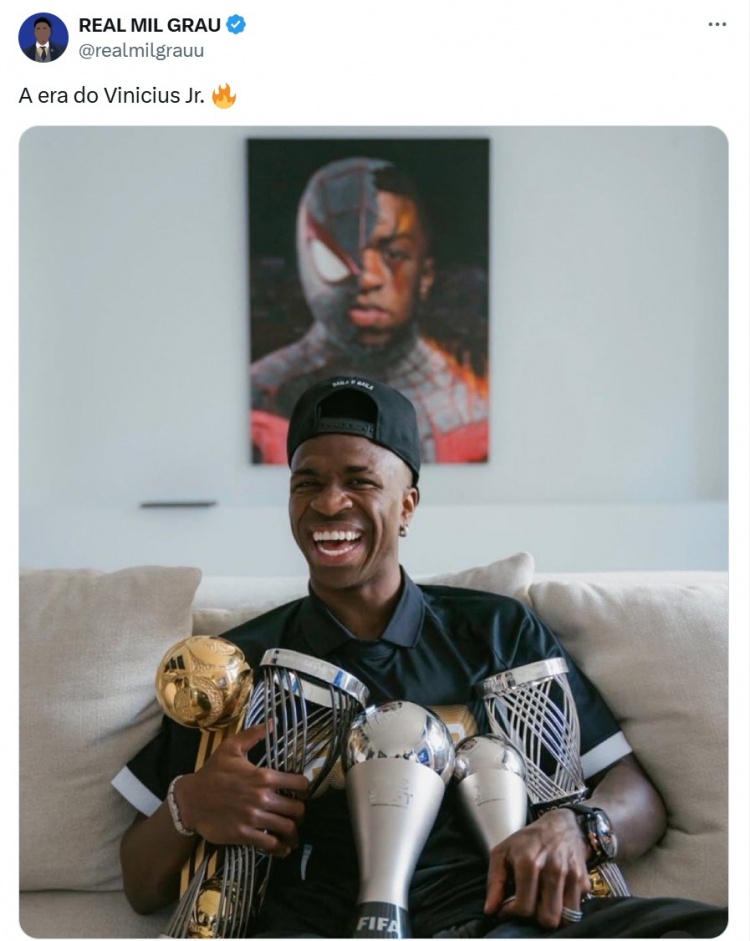 維尼修斯在近日與今年贏得的包括FIFA世界足球先生、洲際杯金球獎(jiǎng)在內(nèi)的5座個(gè)人獎(jiǎng)杯合影,看起來非常開心。