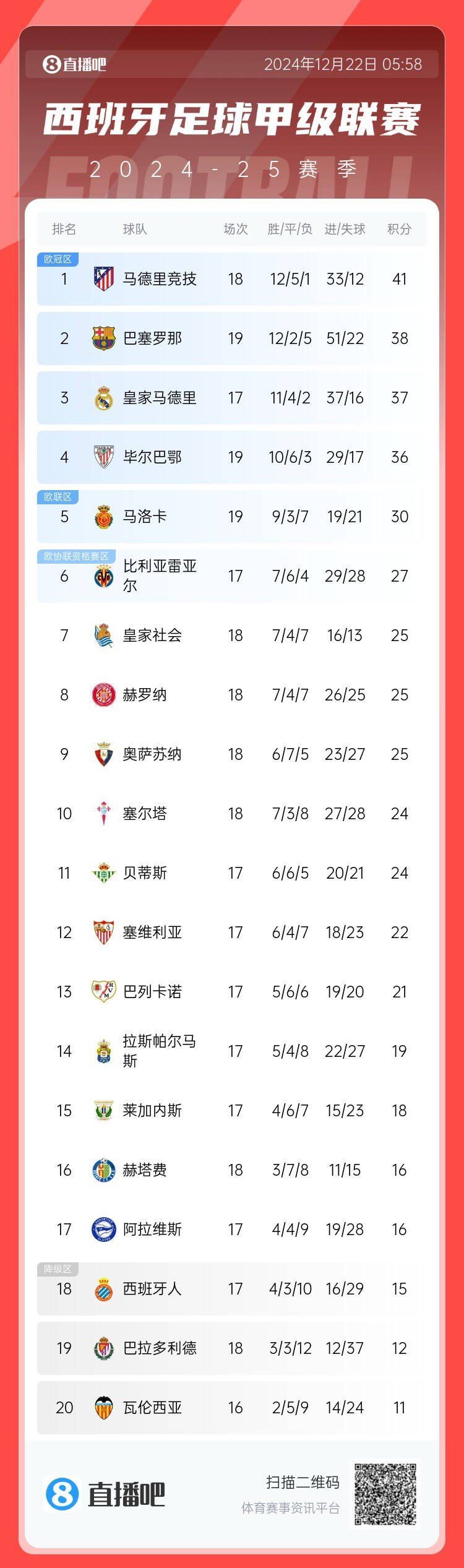 榜首更替!西甲積分榜:馬競(jìng)絕殺登頂 巴薩多賽兩場(chǎng)只領(lǐng)先皇馬1分