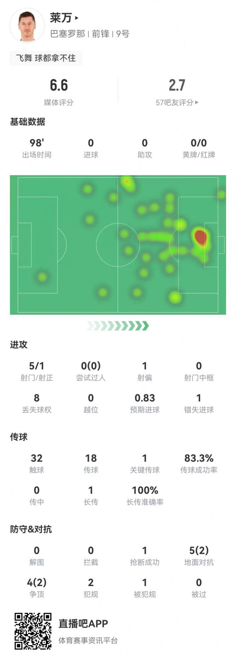 12月22日訊 巴薩在本輪西甲1-2被馬競逆轉(zhuǎn)絕殺,萊萬本場數(shù)據(jù)如下: