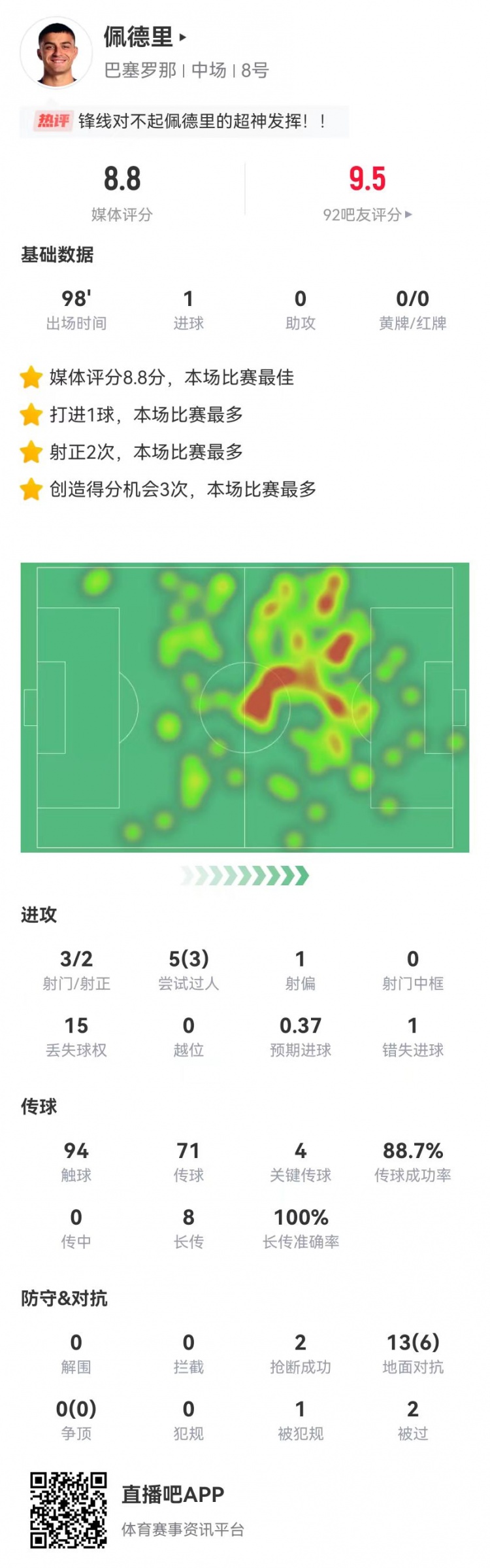 12月22日訊 巴薩在本輪西甲焦點戰(zhàn)主場被馬競2-1逆轉絕殺,佩德里本場數(shù)據(jù)如下: