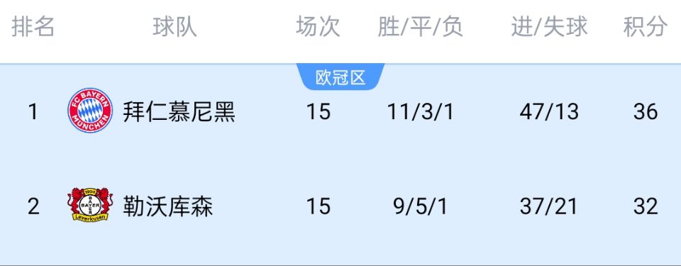 德甲15輪過(guò)后,拜仁積36分排名榜首,勒沃庫(kù)森積32分排名第二。