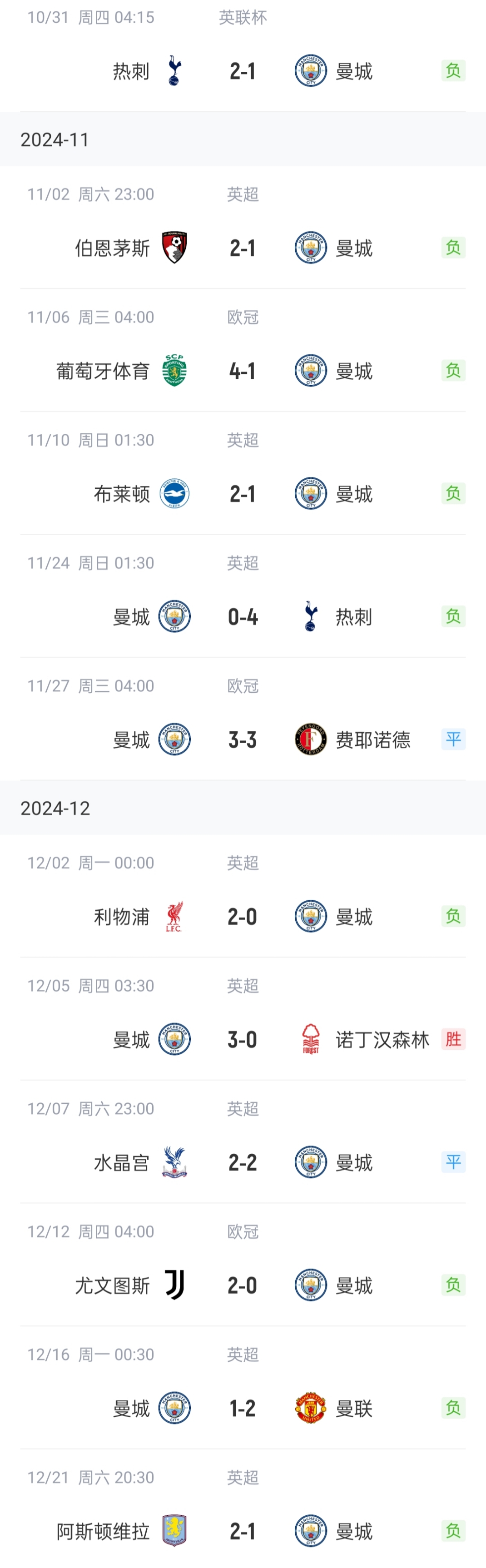 12月22日訊 英超第17輪,曼城1-2不敵維拉。