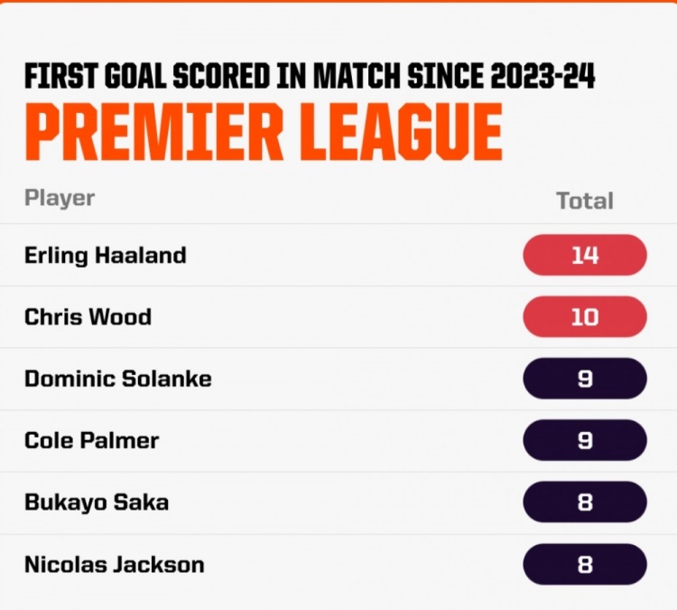 12月4日訊 Opta統(tǒng)計了上賽季至今球員在英超比賽中攻入首粒進球的次數(shù),并列出榜單,哈蘭德14球居首,克里斯-伍德10球次席。