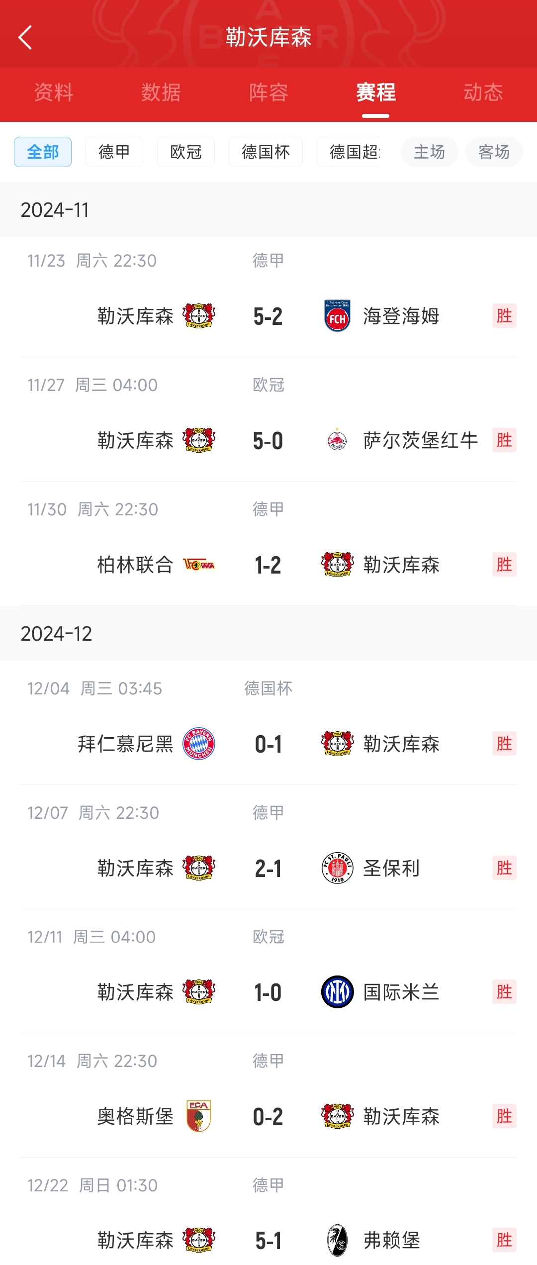 12月22日訊 德甲第15輪,勒沃庫森5-1大勝弗賴堡,各項(xiàng)賽事取得8連勝,距離榜首的拜仁4分。