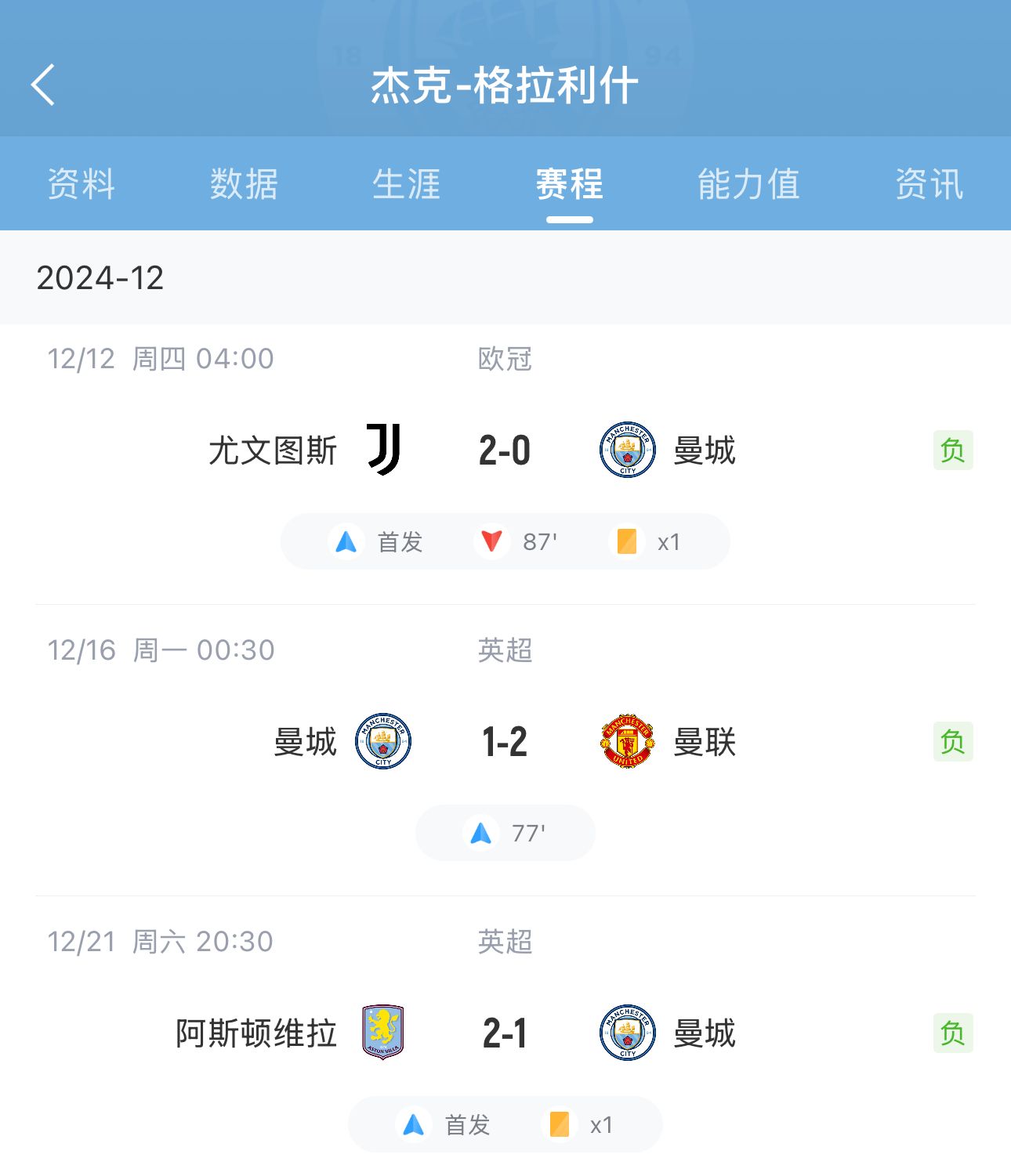 12月22日訊 英超第17輪,曼城客場(chǎng)1-2不敵維拉,格拉利什首發(fā)打滿全場(chǎng),沒(méi)有取得進(jìn)球,但因犯規(guī)吃到黃牌。