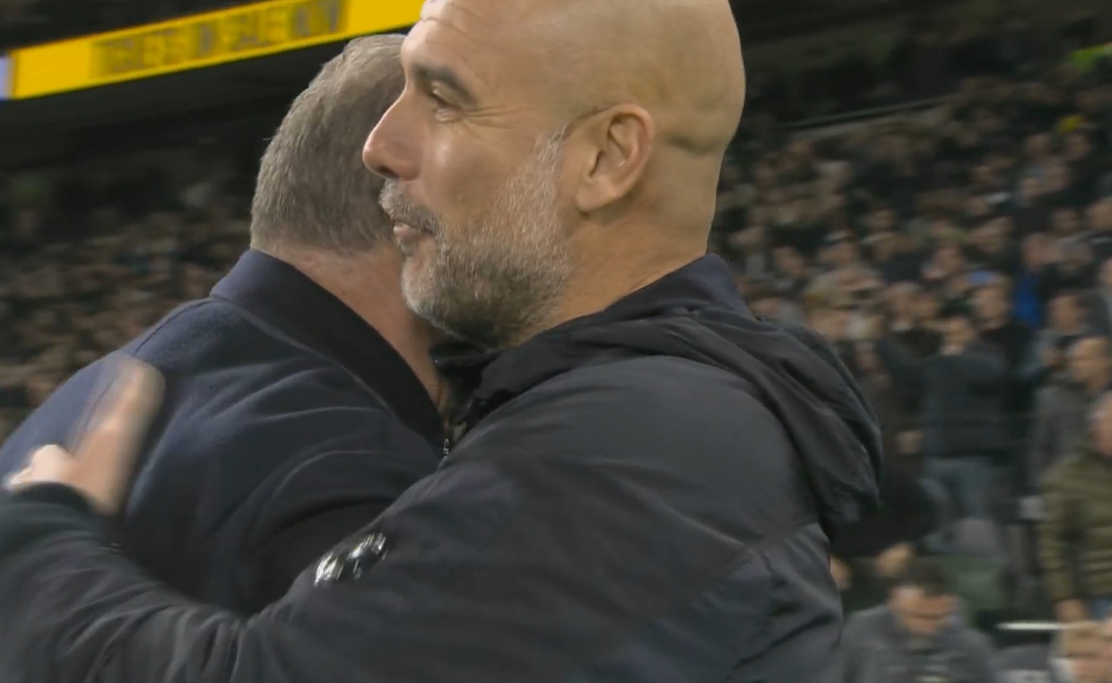 比賽結(jié)束后,瓜迪奧拉笑著和澳波擁抱、交談,頗顯輕松。