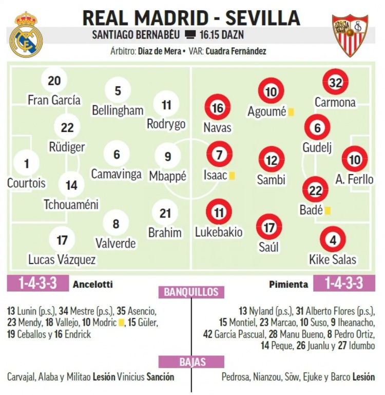 12月22日訊 北京時間今天晚上23點15分,皇馬將在西甲第18輪比賽中主場對陣塞維利亞。西班牙媒體《馬卡報》預(yù)測了兩隊的首發(fā)陣容,羅德里戈、姆巴佩、迪亞斯組成皇馬鋒線三叉戟。