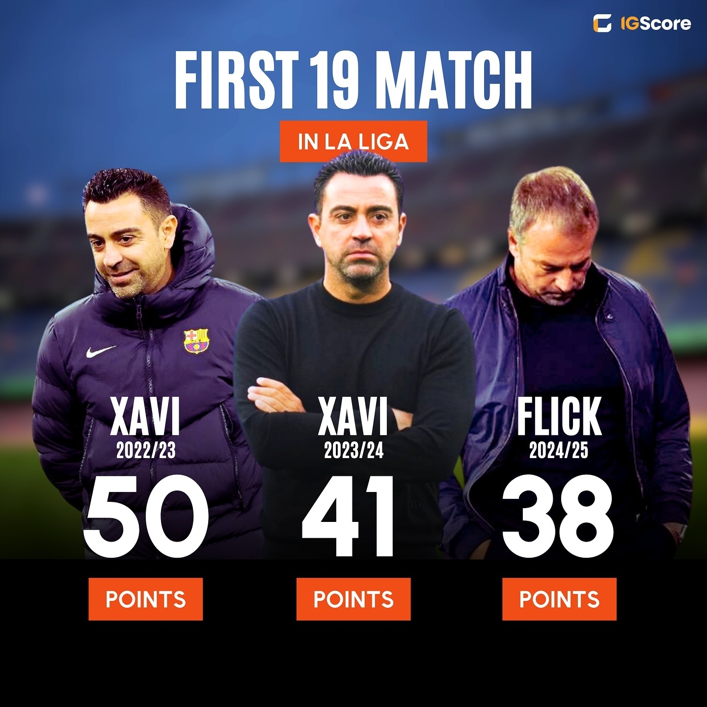 據(jù)媒體統(tǒng)計,弗里克本賽季帶領巴薩西甲前19場比賽拿到38分,低于此前哈維帶隊的兩個賽季。