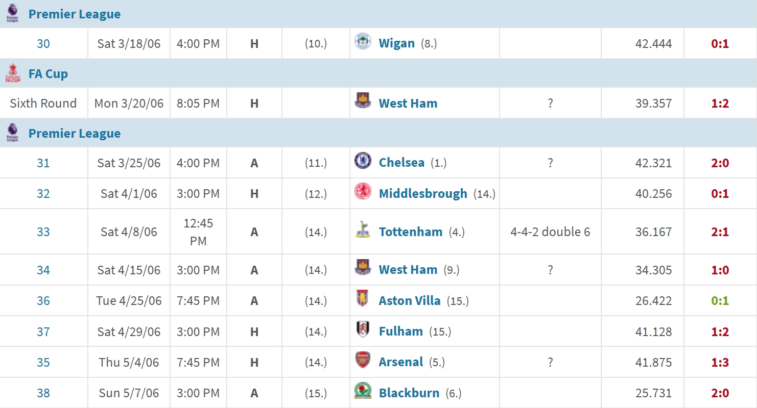 2005/06賽季收官階段,曼城在各項(xiàng)賽事中10場輸?shù)?場,當(dāng)時(shí)中國球員孫繼海是球隊(duì)的主力,他出場了絕大多數(shù)比賽。