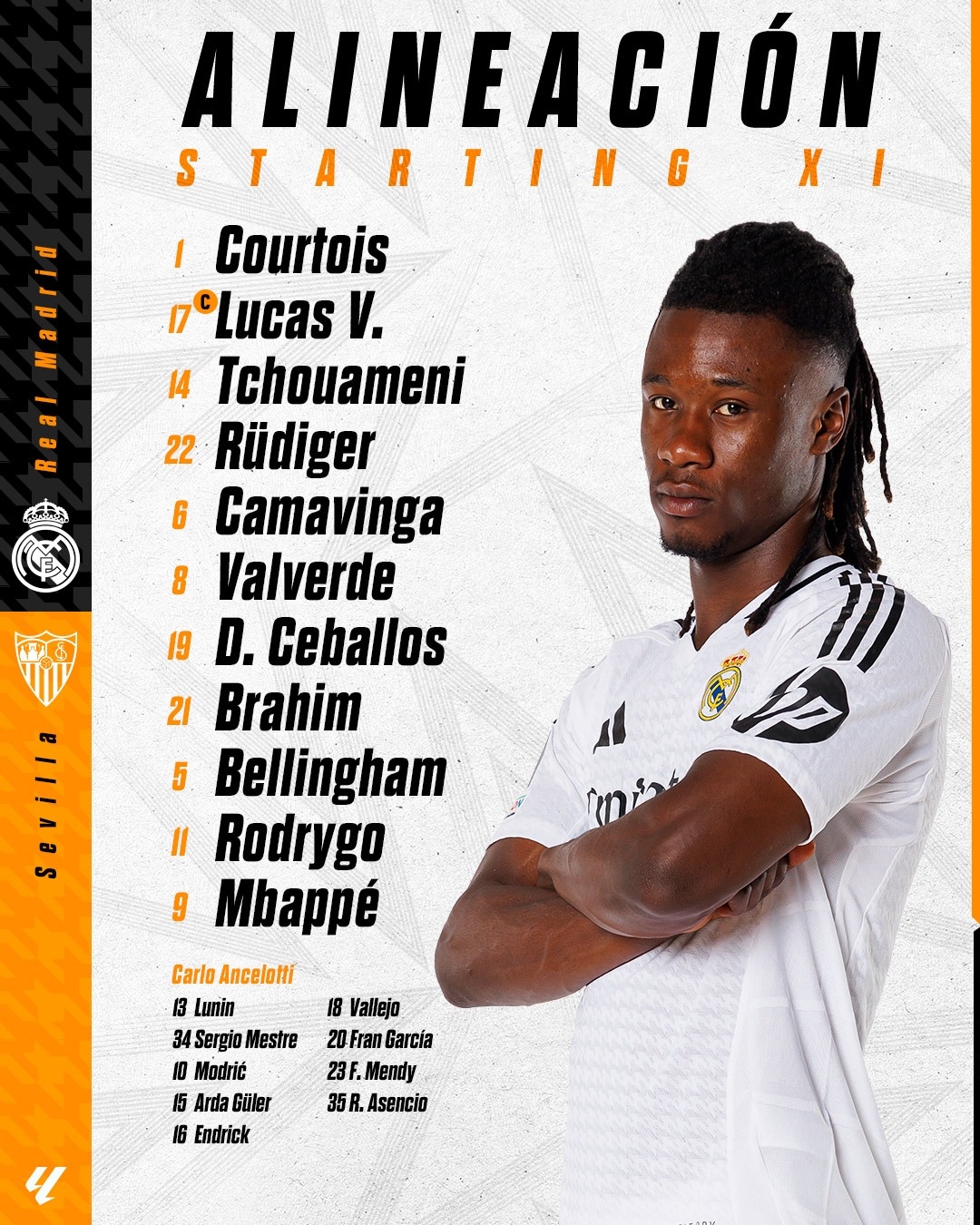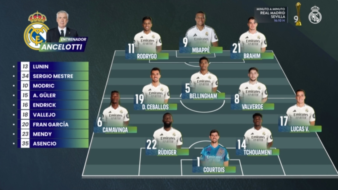 12月22日訊 北京時間今天23:15,西甲第18輪,皇馬主場迎戰(zhàn)塞維利亞,賽前皇馬率先公布首發(fā)陣容。維尼修斯因累積5張黃牌停賽。
