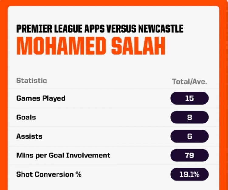 據(jù)Opta統(tǒng)計(jì),薩拉赫在英超15次對(duì)陣紐卡,他打進(jìn)8球并送出6記助攻,參與14粒進(jìn)球,僅對(duì)陣曼聯(lián)(18球)和布萊頓(16球)參與進(jìn)球更多。