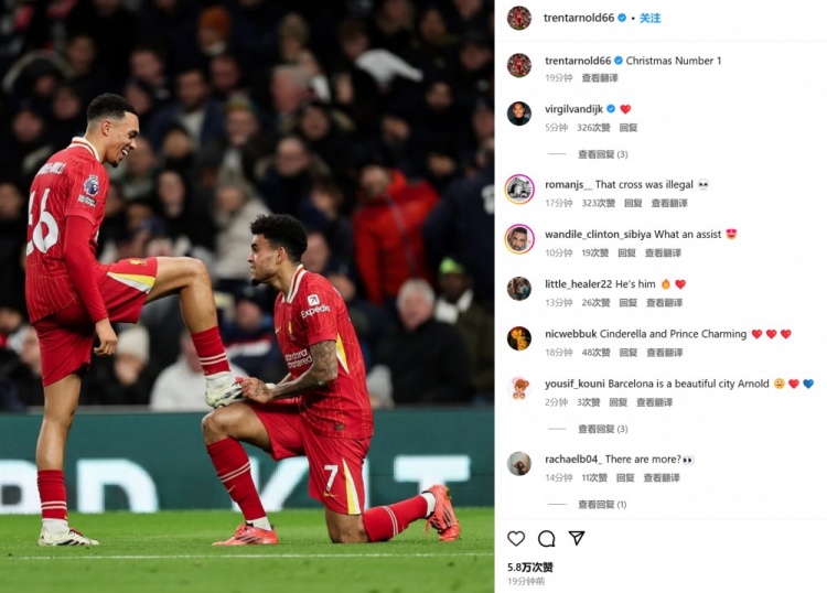 阿諾德賽后也通過社媒曬出了迪亞斯為自己擦鞋慶祝的照片,并配文:“圣誕節(jié)第一”。