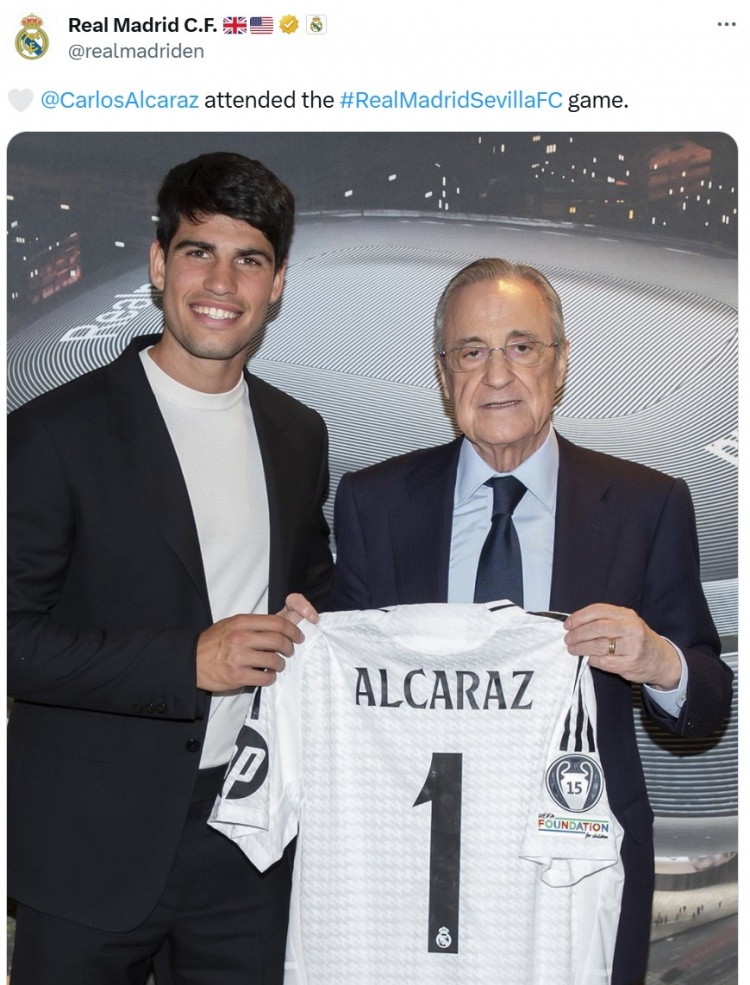 阿爾卡拉斯也被皇馬主席弗洛倫蒂諾親手贈送了一件印有前者名字的1號球衣。