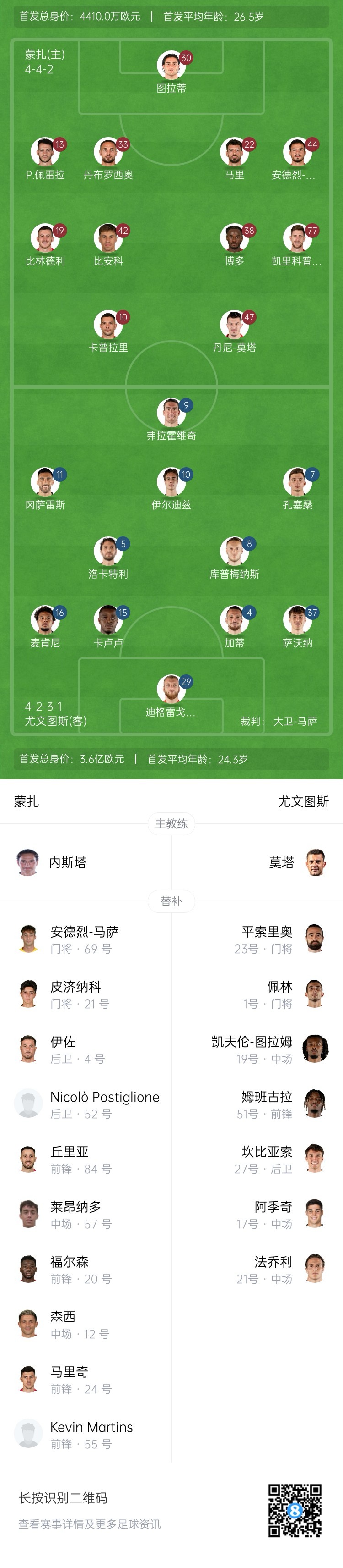 12月23日訊 意甲第17輪,蒙扎主場迎戰(zhàn)尤文比賽即將打響。賽前首發(fā)出爐。