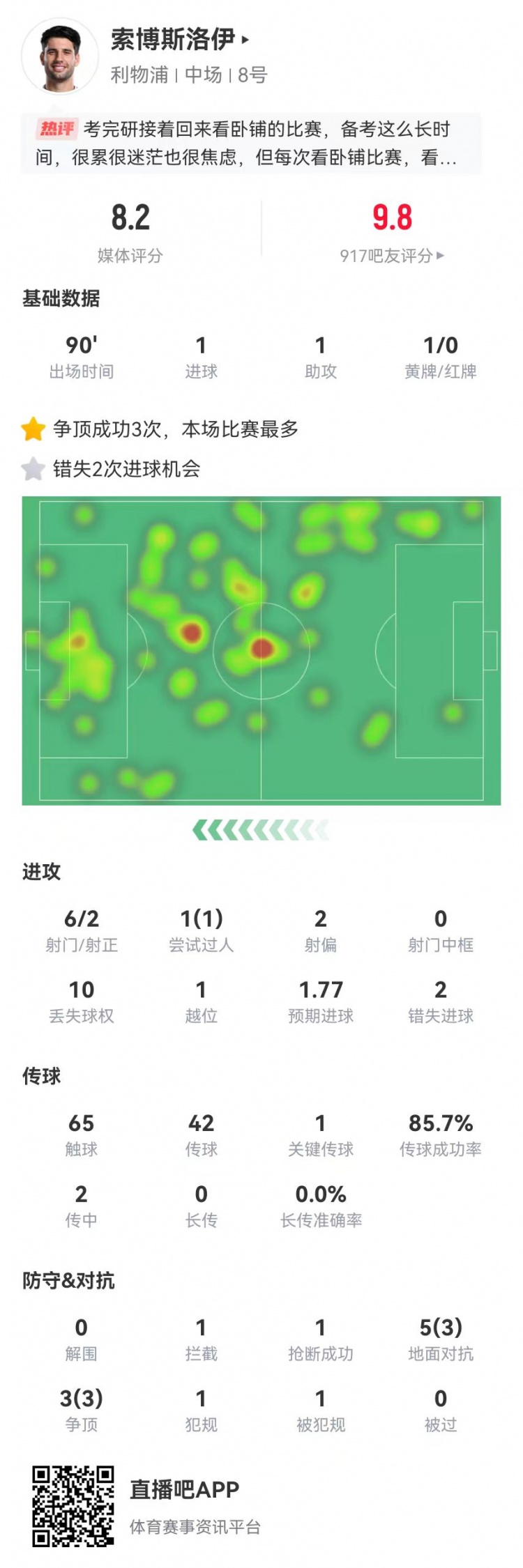 12月23日訊 利物浦在本輪英超6-3大勝熱刺,索博斯洛伊本場數(shù)據(jù)如下: