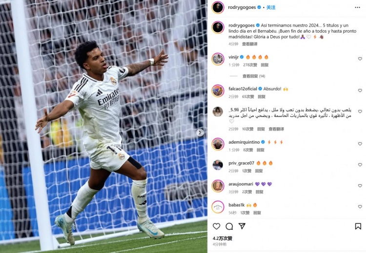 他也在賽后通過社媒曬出自己破門后的慶祝照,并配文:“這就是我們選擇為2024收官的方式。5個冠軍和在伯納烏的美好一天?!?/p>