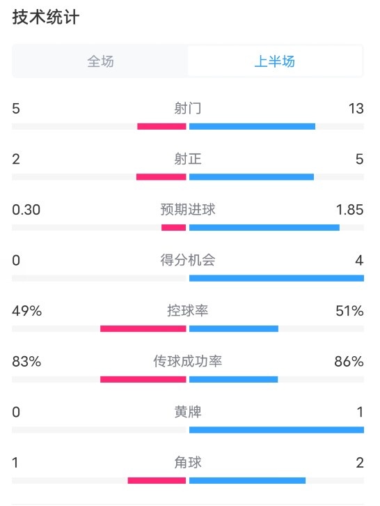 半場(chǎng)比賽數(shù)據(jù)如下(利物浦在后):