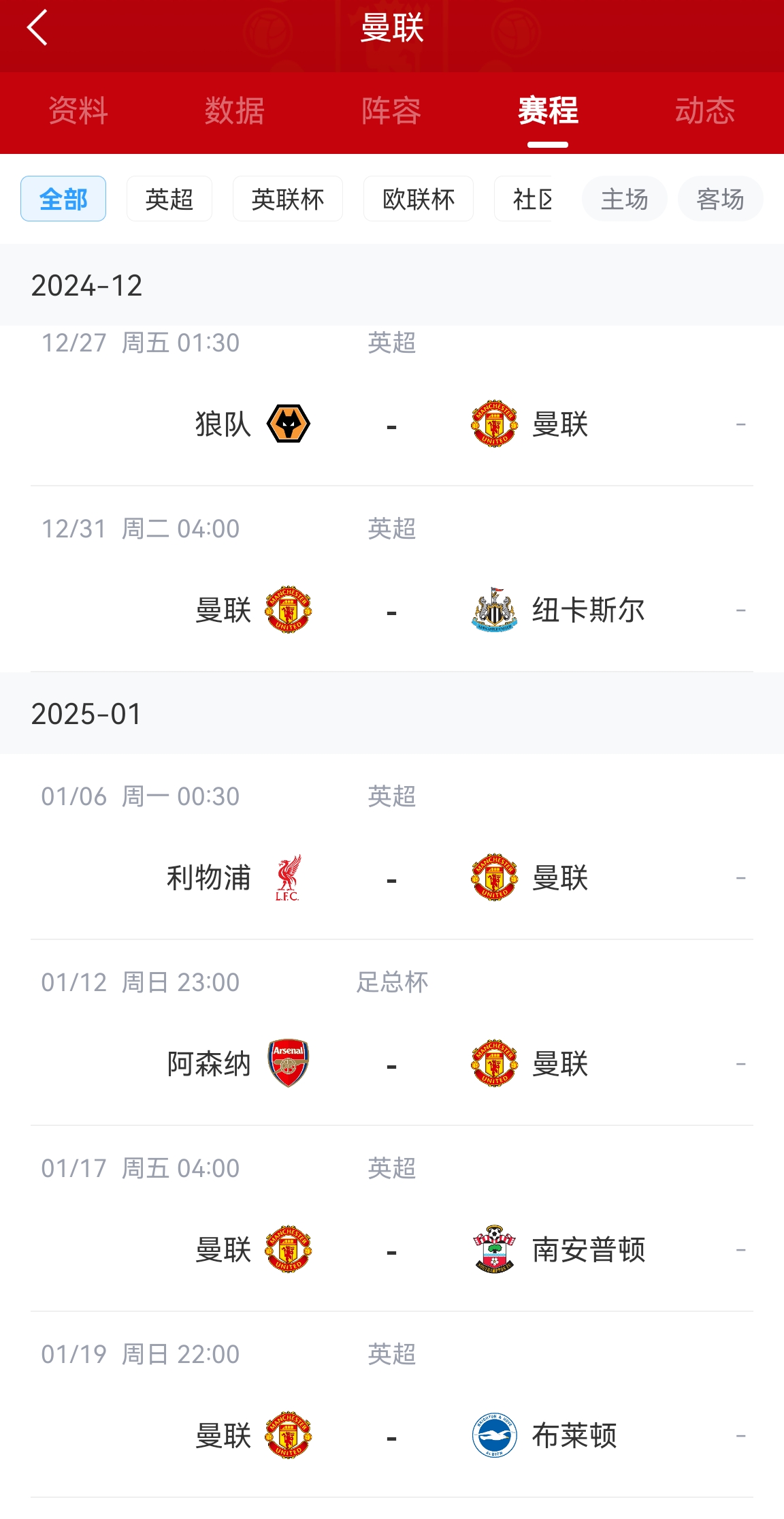 12月23日訊 曼聯(lián)0-3完敗伯恩茅斯,聯(lián)賽近4輪1勝3負(fù)。接下來曼聯(lián)的比賽任務(wù)在國(guó)內(nèi)賽場(chǎng),聯(lián)賽先對(duì)陣?yán)顷?duì)、紐卡,接著就是雙紅會(huì)。1月12日,曼聯(lián)足總杯對(duì)陣阿森納,隨后是聯(lián)賽對(duì)陣南安普頓和布萊頓。