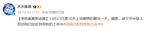 12月23日訊 據(jù)北京電視臺《天天體育》節(jié)目透露,咸寧市中級人民法院已收到李鐵上訴書。