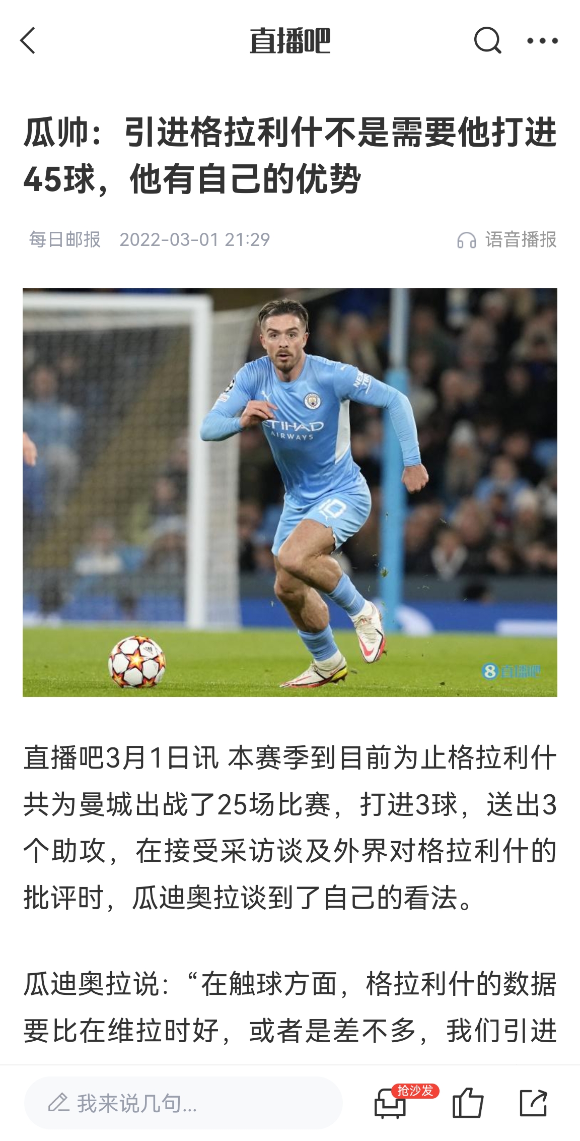 2022年3月,瓜迪奧拉曾這樣談到格拉利什的球荒:“我們引進(jìn)他不是要讓他打進(jìn)45球,他不是那樣的特點(diǎn),他有自己的優(yōu)勢(shì)。