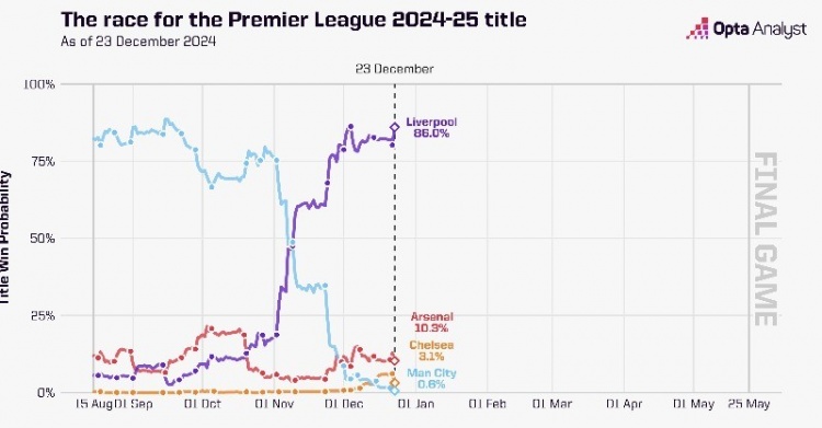 OPTA通過(guò)大數(shù)據(jù)預(yù)測(cè)顯示,紅軍本賽季奪冠希望很大。而衛(wèi)冕冠軍曼城從賽季初的接近80%奪冠概率已經(jīng)幾乎歸零。