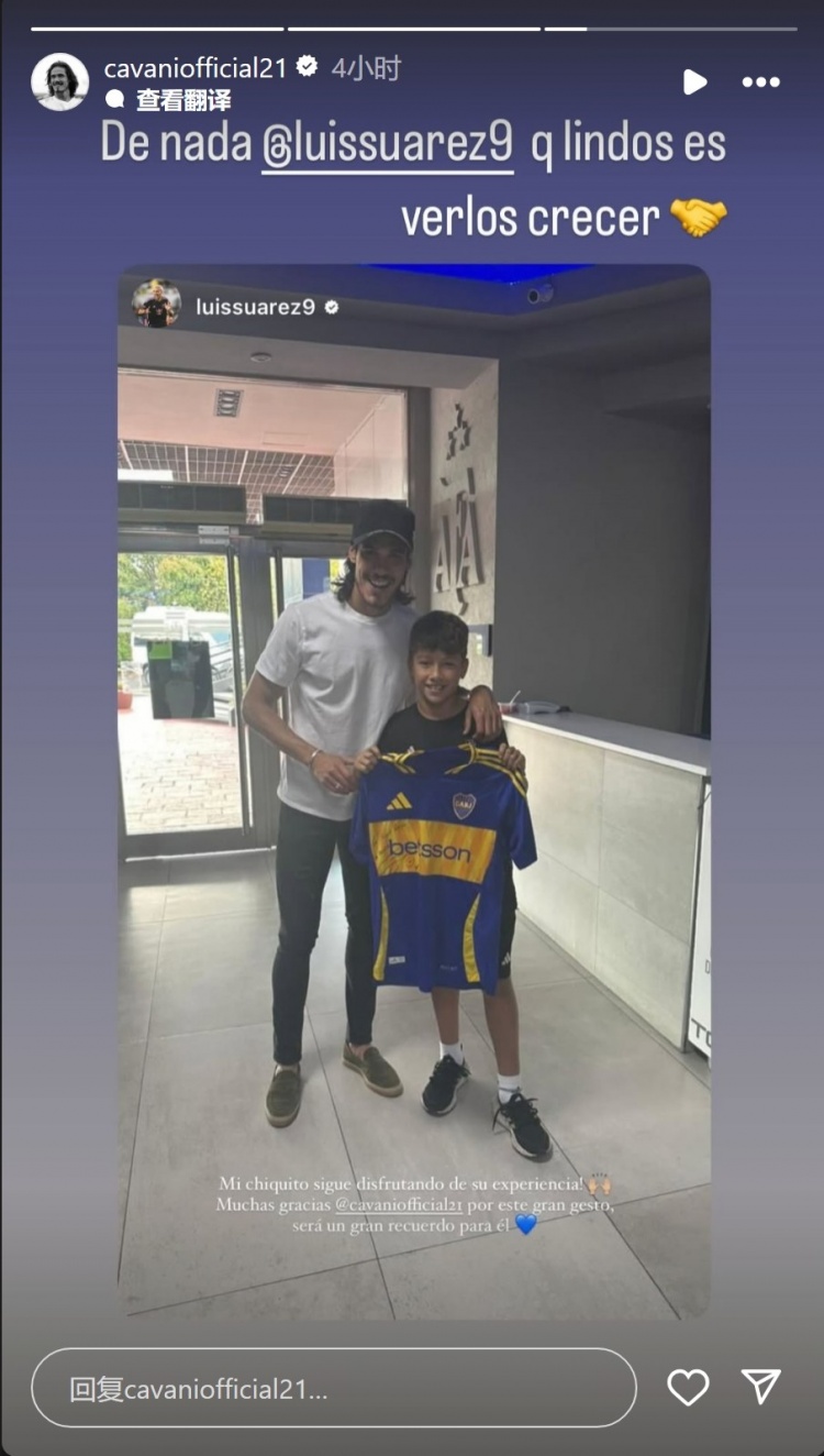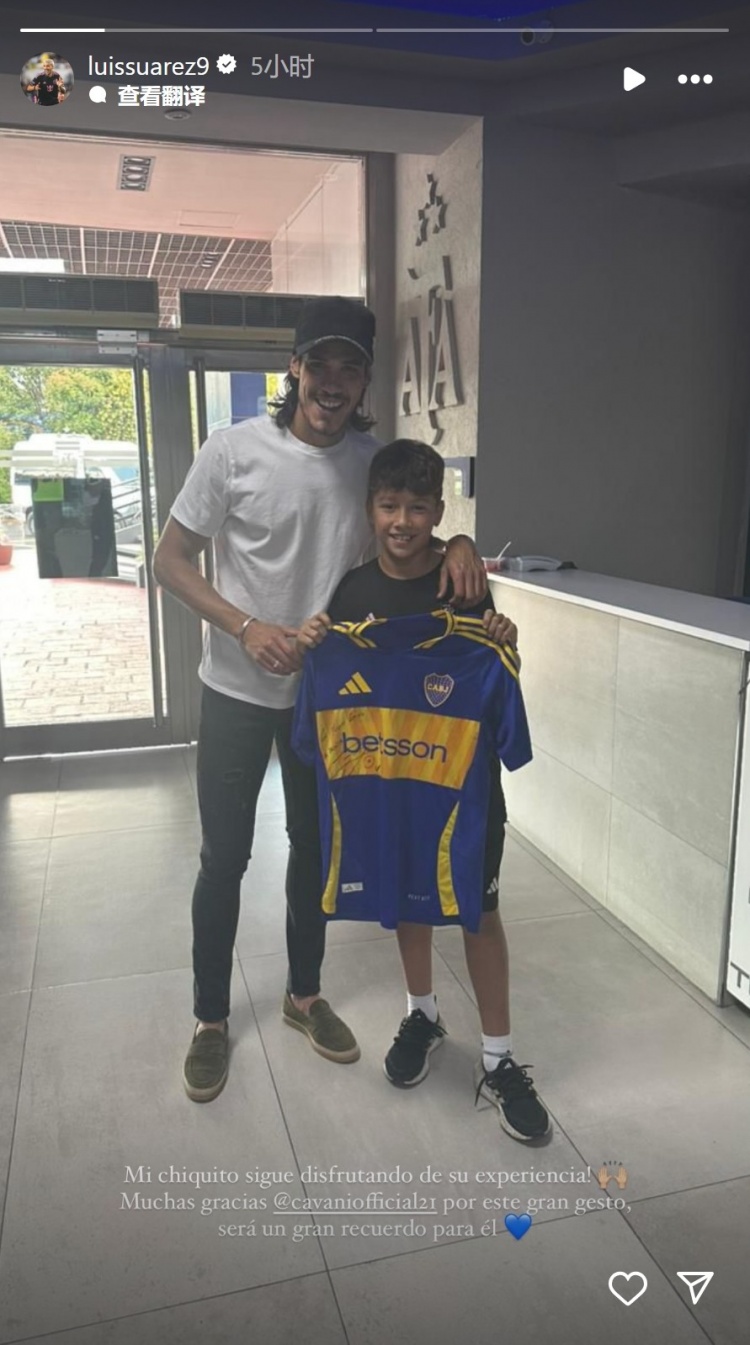 蘇亞雷斯社媒曬出本杰明與卡瓦尼的合照,配文:“我的兒子還在回味這段經(jīng)歷呢!非常感謝卡瓦尼的饋贈,這將成為他的美好回憶。”