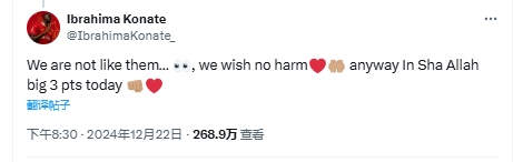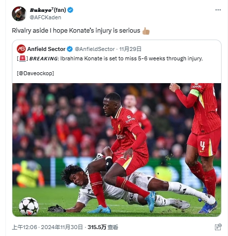 發(fā)布時間:2024年12月23日 22:02點擊:欄目:足球新聞 12月23日訊 科納特因傷缺陣利物浦比賽,但他昨天的社媒發(fā)言收到了球迷的贊揚。上個月末,薩卡球迷在紅軍博主推文下評論,希望科納特重傷。而昨天利物浦vs熱刺賽前,科納特在此人薩卡受傷推文下評論道:“我們不像他們,我希望薩卡沒事。利物浦今天拿3分!” 除特別注明外,本站所有內容均為24直播網整理排版,轉載請注明出處:以德報怨!薩卡球迷希望科納特重傷,科納特回應:我希望薩卡沒事 本文標簽: 英超 阿森納 利物浦 足球