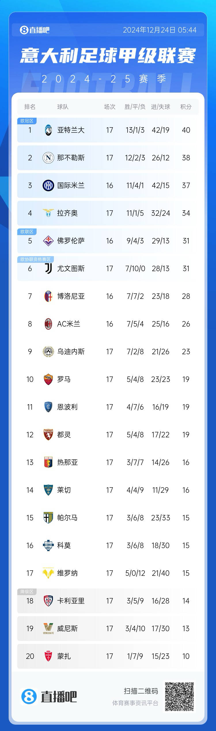 亞特蘭大暫以40分領跑,那不勒斯38分第二,國米37分第三。