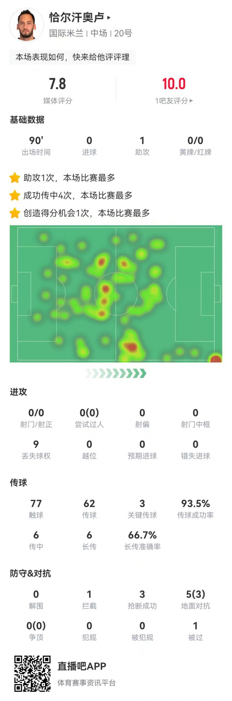 12月24日訊 國(guó)米在本輪聯(lián)賽2-0擊敗科莫,恰爾汗奧盧本場(chǎng)數(shù)據(jù)如下: