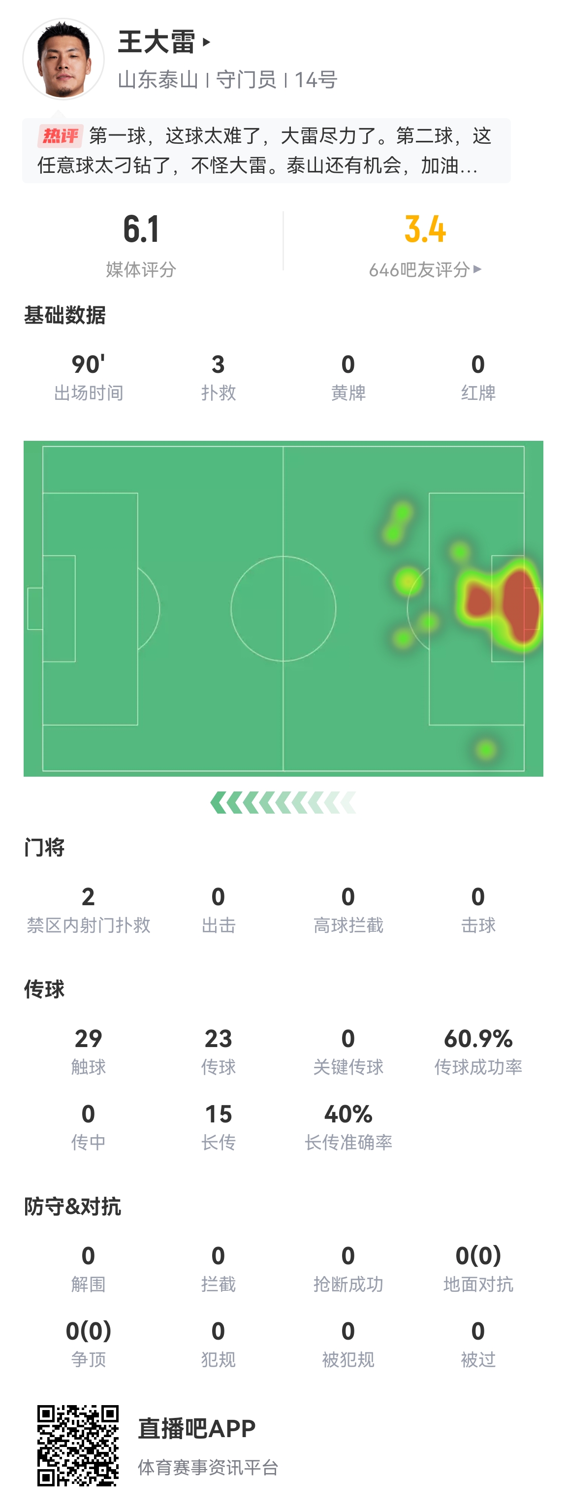 12月04日訊 泰山客場0-4慘敗川崎前鋒,王大雷全場完成3次撲救,媒體評分6.1分。