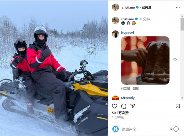 12月24日訊 C羅更新社媒動態(tài),曬出駕駛雪地摩托的照片。