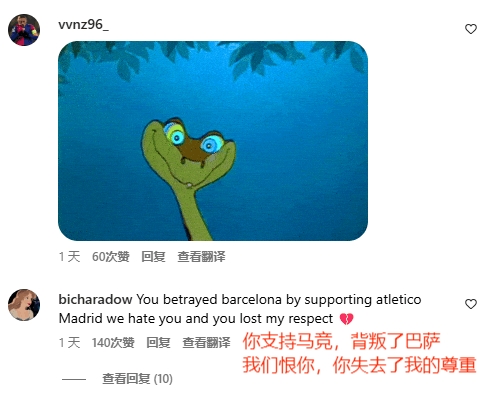 部分巴薩球迷不滿蘇亞雷斯的行為,紛紛到他的ins下留言斥責。
