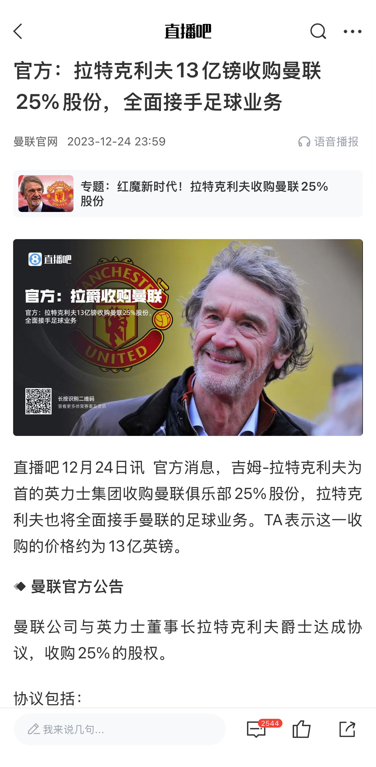 12月24日訊 一年前的今天,曼聯(lián)官方發(fā)布公告,吉姆-拉特克利夫為首的英力士集團收購曼聯(lián)俱樂部25%股份,拉特克利夫也將全面接手曼聯(lián)的足球業(yè)務(wù)。TA表示這一收購的價格約為13億英鎊。