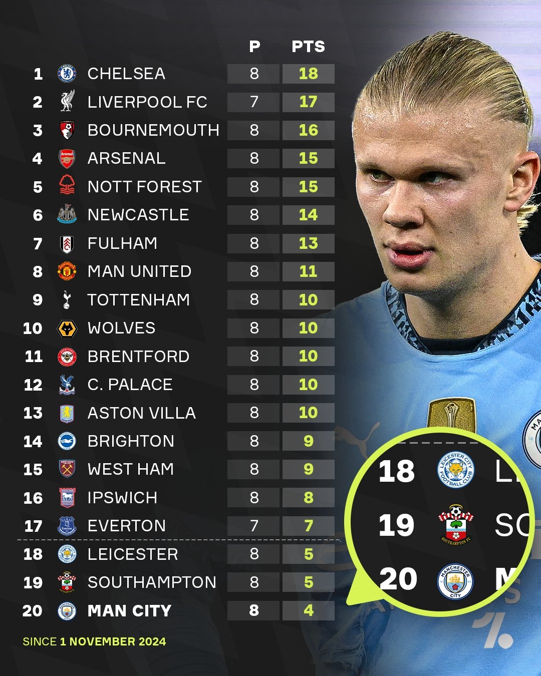 發(fā)布時(shí)間:2024年12月24日 20:01點(diǎn)擊:欄目:足球新聞 除特別注明外,本站所有內(nèi)容均為24直播網(wǎng)整理排版,轉(zhuǎn)載請(qǐng)注明出處:媒體統(tǒng)計(jì)英超11月以來(lái)積分榜:曼城墊底切爾西第1阿森納第4 本文標(biāo)簽: 足球 英超 切爾西 阿森納 曼聯(lián) 曼城 利物浦 熱刺 埃弗頓 南安普頓 阿斯頓維拉 伊普斯維奇 狼隊(duì) 布萊頓 諾丁漢森林 紐卡斯?fàn)?/a> 萊斯特城 伯恩茅斯 水晶宮 富勒姆 西漢姆 布倫特福德