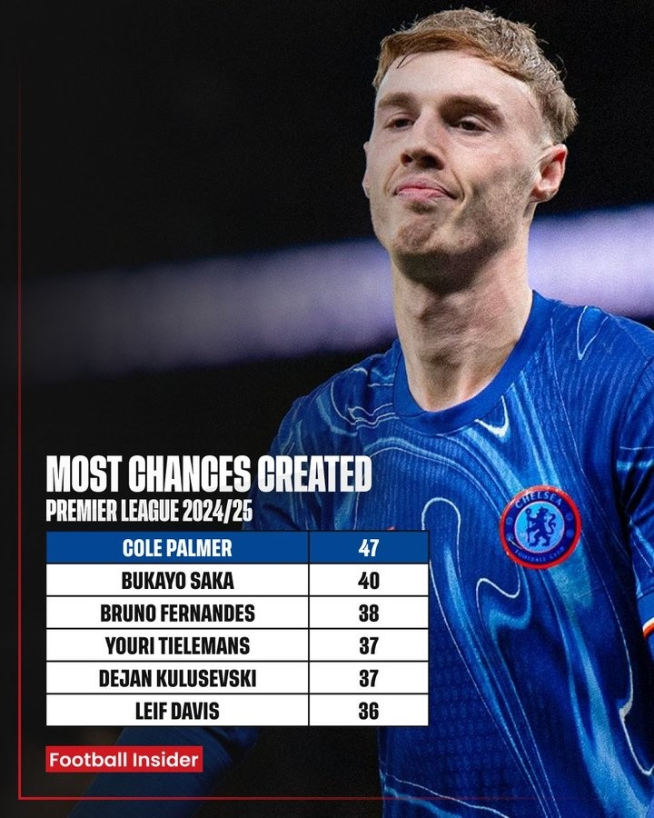 12月25日訊 Football Insider統(tǒng)計(jì),帕爾默是本賽季至今英超創(chuàng)造機(jī)會(huì)次數(shù)最多的球員。