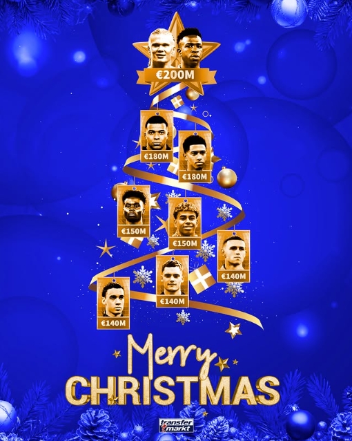 12月25日訊 德轉(zhuǎn)在社媒曬出了一張現(xiàn)今足壇身價(jià)最高的球員圣誕樹,哈蘭德和維尼修斯領(lǐng)銜。