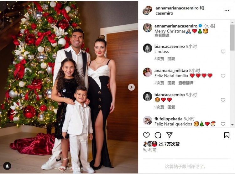 卡塞米羅與瑪麗安娜曬出一家人在圣誕樹前的合照,瑪麗安娜寫道:“圣誕快樂?!?/p>