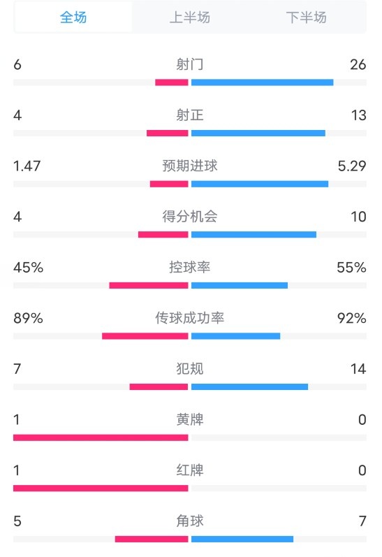 全場(chǎng)比賽數(shù)據(jù)如下(切爾西在后):