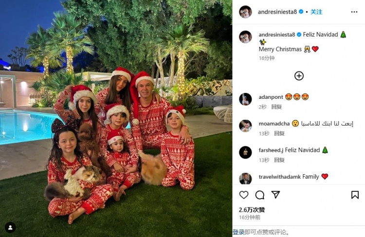 伊涅斯塔上傳了與家人在泳池邊的合影,并用西英雙語配文寫道:“圣誕快樂”。