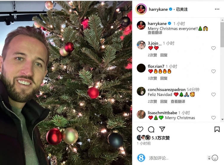 今天是圣誕節(jié),凱恩在社交媒體上曬出自己與圣誕樹的合照,配文:“祝大家圣誕快樂!”