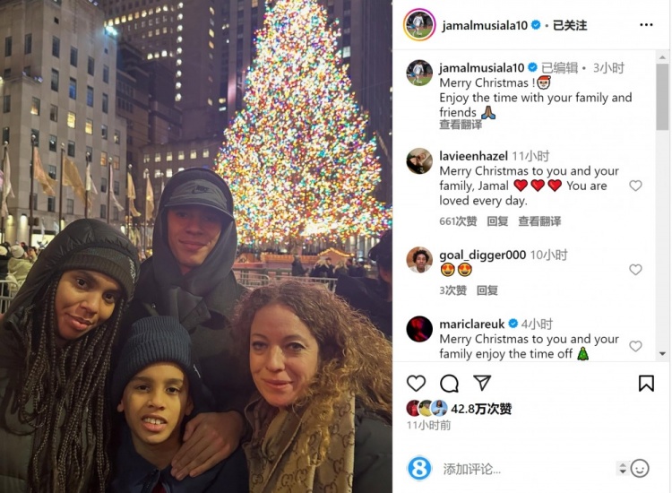 穆西亞拉在社交媒體上曬出與家人的合照,配文:“圣誕快樂,享受與家人、朋友共度的時(shí)光。”