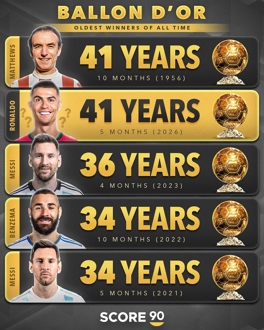 史上最年長(zhǎng)的金球獎(jiǎng)獲得者為英格蘭傳奇球星斯坦利-馬修斯,他在1956年時(shí)的獲獎(jiǎng)年齡為41歲10個(gè)月。