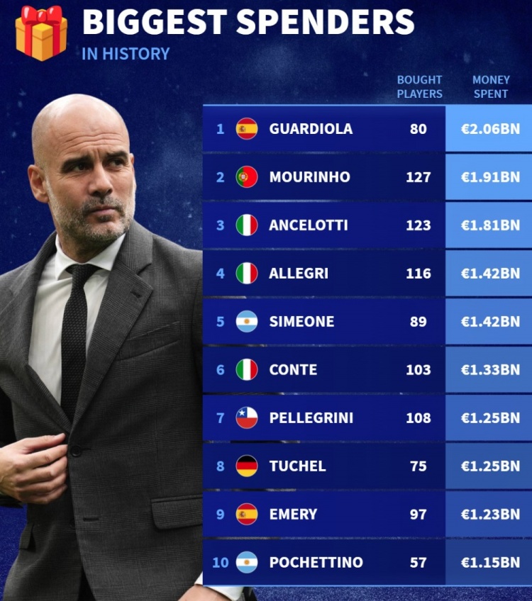 德轉(zhuǎn)歷史主帥支出榜:瓜帥20.6億歐居首,穆帥19.1億、安帥18.1億