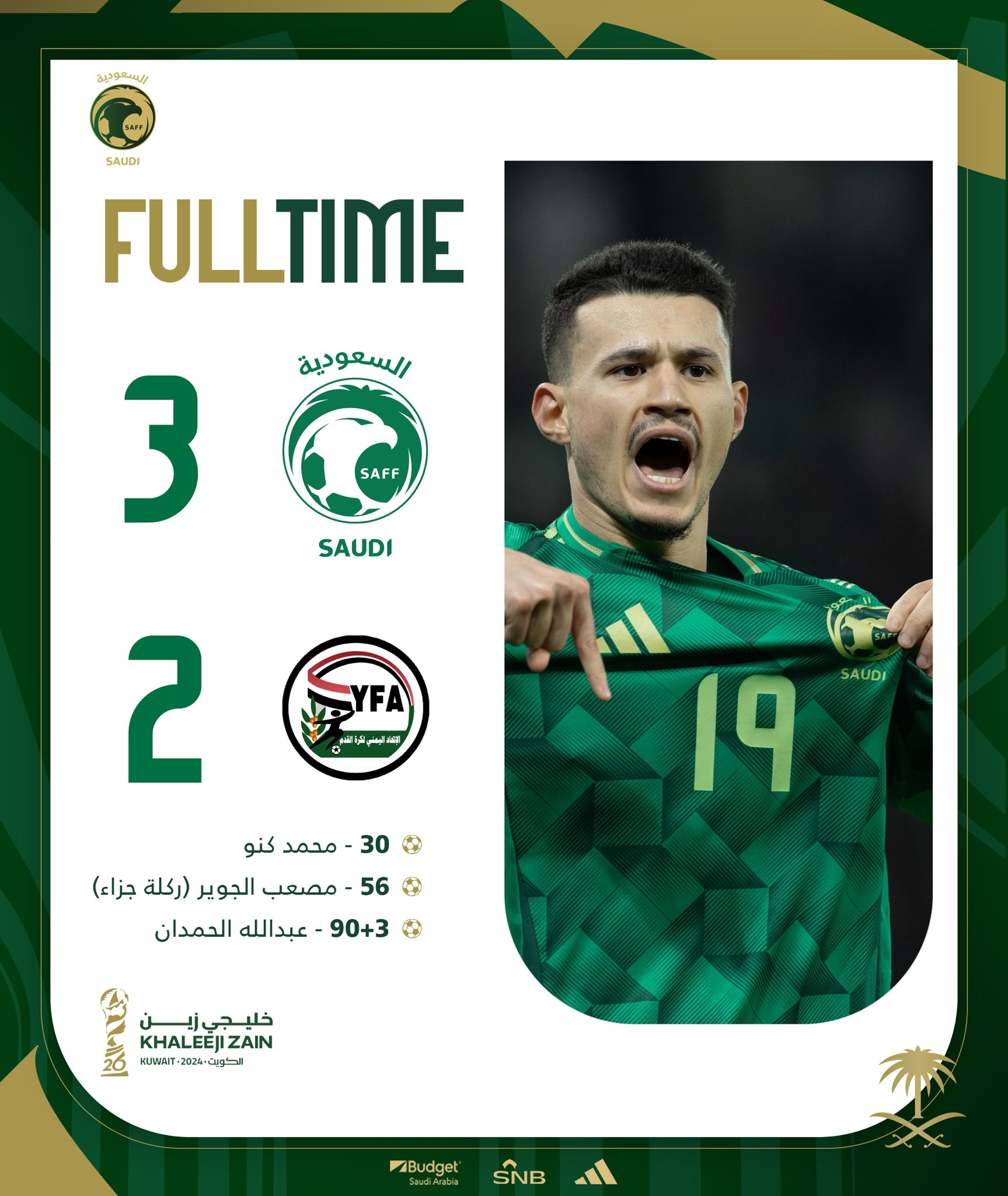 海灣杯B組第二輪也門對(duì)陣沙特,沙特在2球落后情況下3-2補(bǔ)時(shí)絕殺,取得海灣杯首勝。