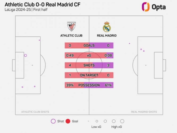 據(jù)OptaJose的數(shù)據(jù)統(tǒng)計(jì),本場比賽上半場,皇馬只嘗試了3次射門,預(yù)期進(jìn)球數(shù)0.08,這是他們本賽季各項(xiàng)賽事客場比賽在上半場的最差數(shù)據(jù)。