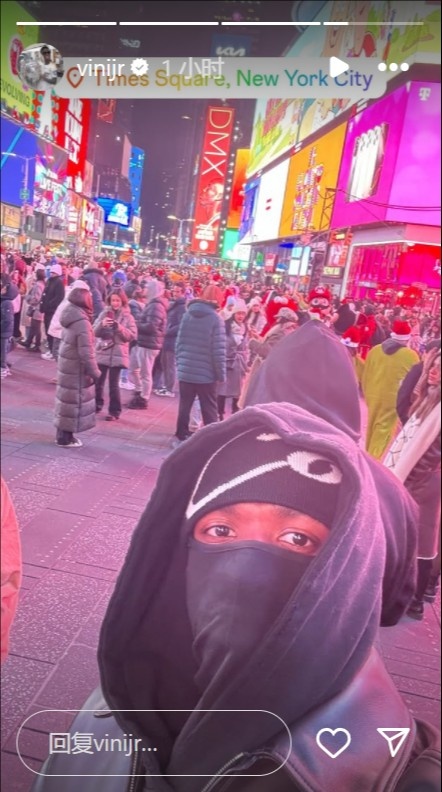 皇馬球星維尼修斯正在美國度假,他在個(gè)人社媒曬出一張自己在紐約時(shí)代廣場(chǎng)街頭的自拍照,照片中他只露出了眼睛。
