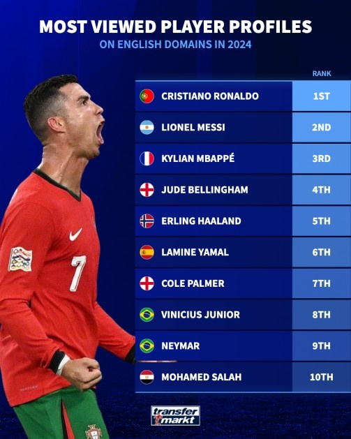發(fā)布時間:2024年12月26日 18:01點擊:欄目:足球新聞 12月26日訊 德轉(zhuǎn)公布2024年度球員頁面瀏覽量排行榜(英文域名),C羅資料頁瀏覽量排名第一,梅西、姆巴佩分列二三,帕爾默進入前十。瀏覽次數(shù)具體排名1-C羅2-梅西3-姆巴佩4-貝林厄姆5-哈蘭德6-亞馬爾7-帕爾默8-維尼修斯9-內(nèi)馬爾10-薩拉赫 除特別注明外,本站所有內(nèi)容均為24直播網(wǎng)整理排版,轉(zhuǎn)載請注明出處:德轉(zhuǎn)英文域名球員資料頁年度瀏覽量排行:C羅、梅西、姆巴佩前三 本文標簽: 足球 五洲 英超 C羅 梅西 邁阿密國際 利雅得勝利 切爾西 西甲 巴塞羅那 皇家馬德里 曼城 哈蘭德 姆巴佩 貝林厄姆