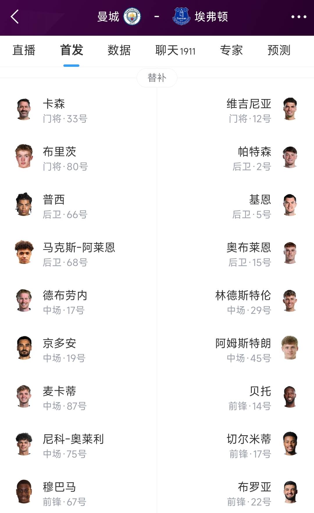 曼城替補:33-卡森、80-布里茨、68-阿萊恩、66-普西、17-德布勞內(nèi)、19-京多安、75-奧賴利、87-麥卡蒂、67-穆巴馬