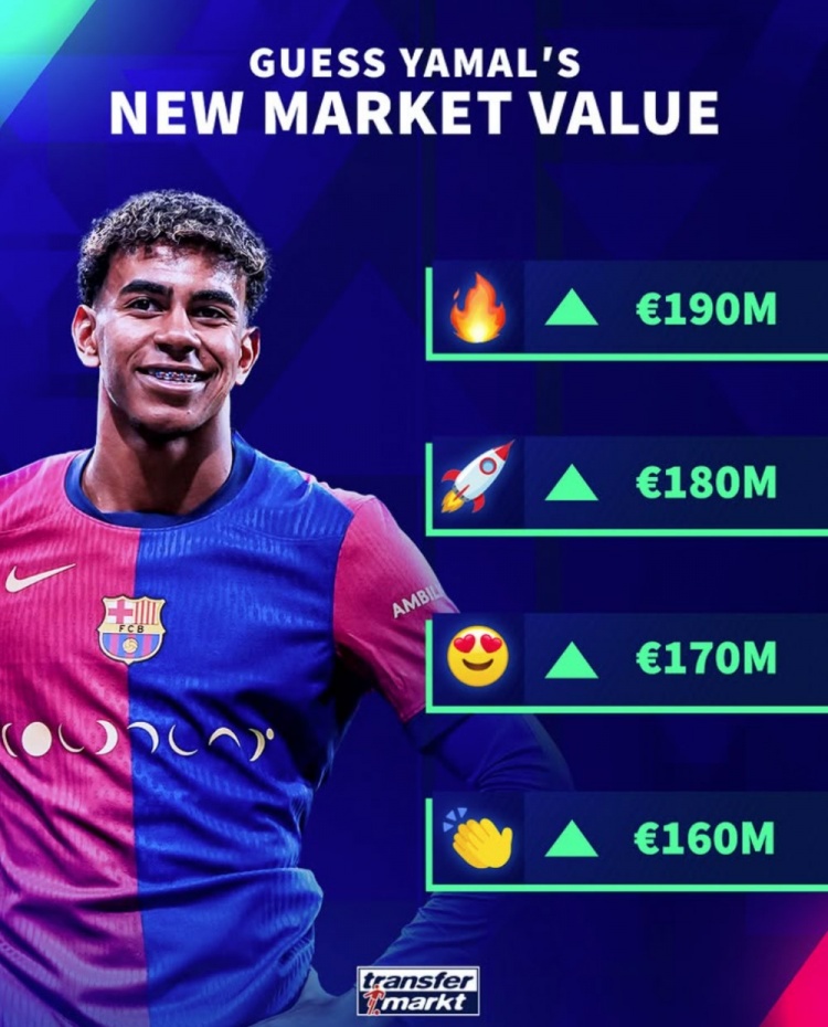 而德轉(zhuǎn)預(yù)熱透露,亞馬爾此次身價(jià)更新至少將上漲至1.6億歐,最多甚至可能達(dá)到1.9億歐元。